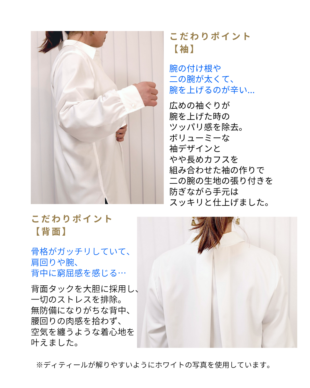 広めの袖ぐりが腕を上げた時のツッパリ感を除去。