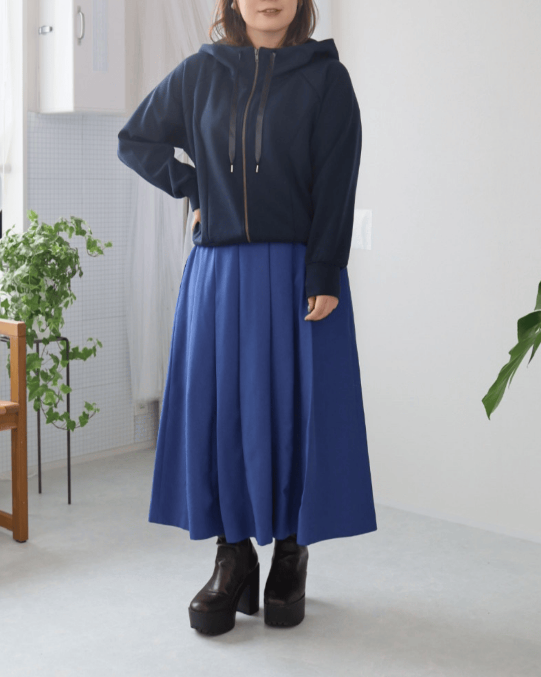縦のラインをつくりつつ折り込むデザインのタックスカートにすることで、綺麗にAラインに広がる生地量は確保しつつ腰回りが広がりにくい仕様にしました◎